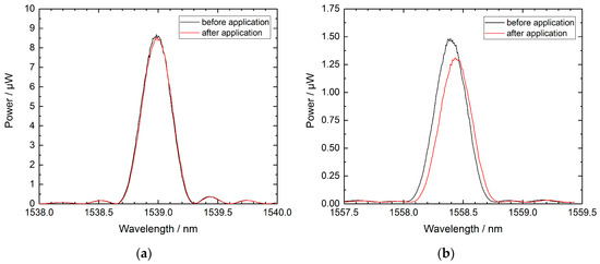 RFBG spectra at reference temperature of about 24 °C before and after two years of operation at temperatures up to 500 °C. (a) RFBG #2 of array A1 shows no changes. (b) RFBG #6 of array A2 comprises a red shift of 48 pm and a slight degradation in reflected power.