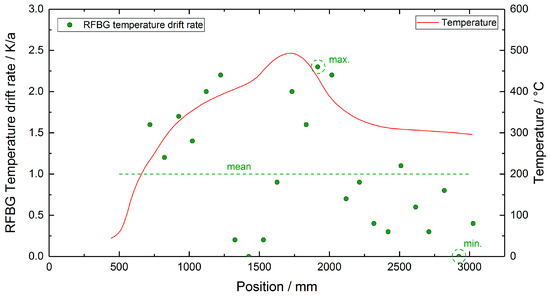 So far, there are only a few publications on the drifts of RFBGs at high temperatures that are based on time scales of one year or more. In [13], Laffont et al. reported on the long-term annealing of four packaged RFBG sensors at temperatures ranging from 760 °C to 890 °C. After 9000 h of isothermal annealing, the RFBG elements experienced wavelength shifts larger than 500 pm, corresponding to temperature drift rates of more than 30 K/a [13]. This is considerably higher than the maximum drift rate of 2.3 K/a found in the present study, but this may be attributed to the significantly higher operating temperatures in [13].