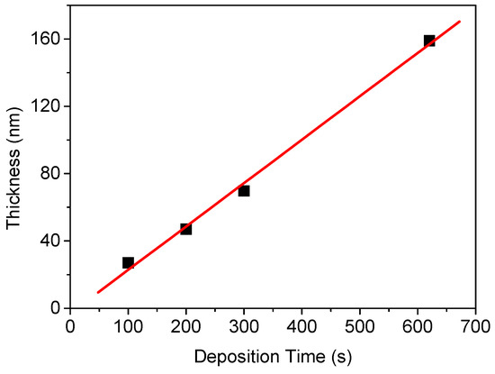In this study, n-type 4H–SiC wafers were used as substrates to produce hydrogen sensors for high-temperature application. The SiC substrate size was 4 inch (or 1.2 × 1.2 cm2 in size). After pre-cleaning, tantalum (Ta) films were deposited on the SiC substrate at power of 600 W, pressure of 2 mTorr, and argon (Ar) flow rate of 20 sccm. Then, the Ta2O5 layer was formed using an RTO process for two minutes at a temperature range of 900 to 1000 °C. Figure 1 shows the relationship between deposition time and formation thickness of tantalum. Applying this process, tantalum with a thickness of ~50 nm was formed at a flow rate of 200 s.