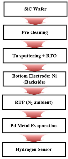 A nickel (Ni) film was deposited on the backside of the wafer to form electrodes, and the annealing process was conducted for one minute at 950 °C for ohmic contact, after which Pd was deposited for 2 min at 300 W power with shadow masks of three different patterns in order to form the front Pd electrodes. The SiC substrates (hydrogen sensors) were attached to the quartz plates within a 3 × 3 cm2 area and were finished with wire bonding. Figure 2 shows the overall process flowchart for fabricating the hydrogen sensors with the Pd (top)/Ta2O5/SiC/nickel silicide (NiSix) structure.