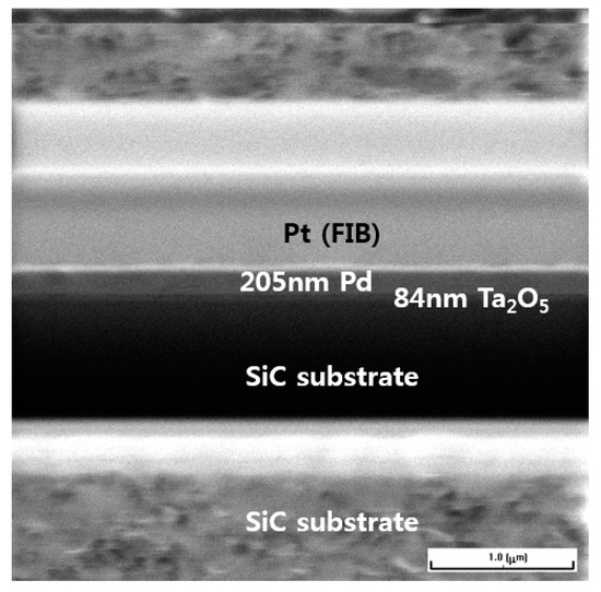 The sensors are made of a MIS structure. Pd film with a thickness of 200 nm was deposited over the Ta2O5 layer. Figure 3 shows a focused ion beam (FIB)-SEM image of the cross-section of the sensor. Initially, the thickness of the tantalum film was 50 nm, but after the RTO process the thickness of the Ta2O5 layer increased to approximately 80 nm. The thickness of NiSix used as the bottom-side electrode was determined to be approximately 100 nm. In a previous study [24], it was reported that the thermally stable Ni–Si silicide layers had excellent ohmic properties and no hysteresis behavior was observed on 4H–SiC substrates after rapid thermal annealing (RTA) at temperatures of 925 to 975 °C. Platinum (Pt) in the FIB-SEM image indicates a layer formed during the sample preparation by the FIB to protect the Pd layer from damage.