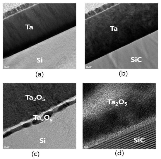 We compared the interface of Ta2O5/substrates formed by RTO deposited on Si and SiC substrates using TEM at an RTO temperature from 900 °C to 1000 °C in order to assess the uniform distribution of components at the interface. Figure 4 shows the cross-sectional TEM images of as-deposited Ta layers (Figure 4a,b) and Ta2O5 layers after RTO for 2 min in 5 standard liters per minute (SLPM) ambient oxygen (Figure 4c,d). TEM images show deposition on Si (Figure 4a,c) and on SiC substrates (Figure 4b,d). Following RTO, the interface of the Ta2O5 layer/substrate formed on SiC substrates was more uniform than that of the interface of the Ta2O5/substrate.