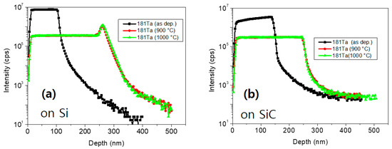 This result was confirmed by SIMS measurement. Figure 5 shows SIMS depth profiles of Ta atoms deposited on Si and SiC substrates, respectively, before and after RTO above 900 °C for 2 min. The Ta atoms accumulated at the interface of the Ta2O5/Si substrate after RTO above 900 °C, whereas there was no such accumulation at the interface of the Ta2O5/SiC substrate (Figure 5a). Therefore, it was confirmed that the Ta2O5 layer on the SiC substrate is a more stable substrate than that on the Si substrate at high temperatures over 900 °C.