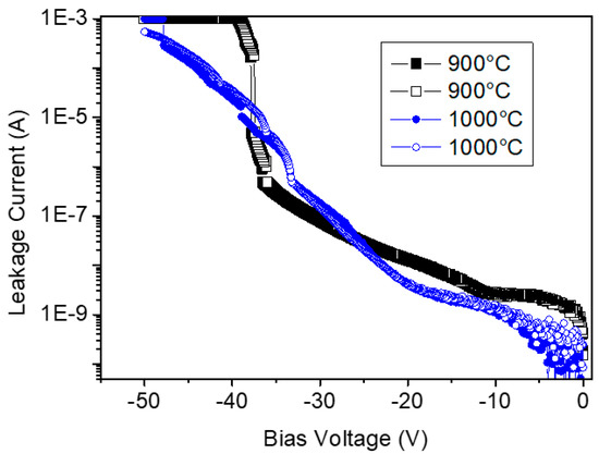 Figure 6 shows the current–voltage (I–V) properties for the samples in the MIS structure consisting of Pd electrode and Ta2O5 dielectric layer on the SiC substrate. The voltage was applied with a step of 0.1 to −50 V. The direction of the applied voltage was based on the Pd electrode, and the thermal treatment temperature of the Ta2O5 layer ranged from 900 °C to 1000 °C before Pd film deposition. The breakdown field was shown to be ~1.5 MV/cm. In general, the operating voltage of the sensor was <10 V. The leakage current was very low in the low electrical field even though it was shown to increase over −20 V.