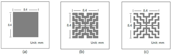 We fabricated sensors with Pd electrodes consisting of three different patterns in order to assess the effects of Pd electrodes on hydrogen sensors. Figure 7 shows the three types of mask patterns for Pd electrodes, where the gray area is the open area of the mask. The Pd is deposited over the Ta2O5 layer. The patterns were designed into square or grid shapes, and comprised 100%, 75%, and 50% area ratios of Pd electrodes covered on the Ta2O5 layer. Figure 7a–c, show the 100% opened mask pattern sized 8.4 × 8.4 mm2, 75% opened mask pattern sized 8.4 × 8.4 mm2, and 50% opened mask pattern sized 8.4 × 8.4 mm2, respectively.