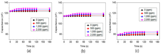 Figure 9 shows the results obtained at 200 °C. At 200 °C, the capacitance gradually increased when the hydrogen concentration increased to 2000 ppm compared to the capacitance at room temperature. Overall, our results showed that the higher the concentration of hydrogen, the higher the capacitance of the sensor, which was assumed to be due to the increase in PdHx passing through the Pd catalytic electrode as the temperature increased. Figure 9a shows the capacitance of a 100% area ratio of the Pd electrode. The initial value of the capacitance was about 125 nF. Figure 9b,c shows the results obtained from sensors with a 75% and 50% area ratio of the Pd electrode, respectively. The initial values of the capacitance decreased as the area of Pd electrode became smaller, achieving 112 and 80 nF capacitance, respectively.