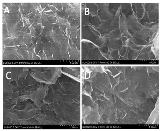 SEM images of (A) graphene hydrogel (GH)-3.5, (B) GH-5.3, (C) GH-7.4, and (D) GH-9.5.