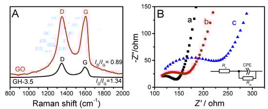 Figure 2A shows the typical Raman spectra of GO and GH-3.5, which displays two characteristic bands at about 1350 (D band) and 1600 cm−1 (G band). The D band corresponds to the A1g breathing mode of the six-atom ring (sp3 bonded carbons), and the G band relates to the high frequency E2g phonon of the sp2 bonded carbons [42,43]. According to the Raman spectra, the ID/IG ratio in GH is 1.34, while that of GO is 0.86. This indicates a decrease in the average size of sp2 sites in GH and alteration in the structure of GO during the reduction process with increasing structural defects [44,45]. The GH-3.5 was also characterized by EIS. As can be seen in Figure 2B, the inset is a fitting simulation circuit of the Nyquist spectrum of EIS, the fitting data are listed in Table S1 (Support Information). Here, the constant phase element (CPE) is defined by two values, CPE-T and CPE-P. CPE-P can indicate how close it is to a standard capacitor. If CPE-P equals 1 then the CPE is identical to that of a capacitor. The solution resistance Rs values obtained at three electrodes are quite close. The values of the electron transfer resistance Rct are 82.8 ± 5.1 Ω (bare GCE), 119.2 ± 3.7 Ω (GH-3.5/GCE), and 169.6 ± 5.6 Ω (GO/GCE). This indicates that GH-3.5 is more conductive than GO, which makes it a potential nanomaterial in sensor fabrication.