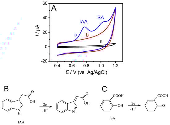 The most powerful tools to simultaneously identify and determine multiple phytohormones are chromatographic techniques combined with sensitive detectors or tandem mass spectrometry [7,8,9,10,11]. Although such techniques possess advantages of excellent sensitivity and selectivity, efficient separation, and fast determination, they are limited to complicated and time-consuming sample preparation methods and require expensive apparatus to perform the test. Over the past decade, researchers have been pursuing alternative methods for the determination of phytohormones, including fluorescence spectrometry [1], enzyme-linked immunosorbent assay [12], and electrochemical analysis [13,14,15]. Among these, the electrochemical biosensors are the most promising given their inherent advantages of being simple, sensitive, rapid, portable, and cost-effective [11,13,14,16].