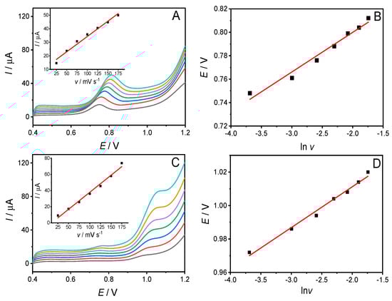 The electrochemical behaviors of 40.0 µM IAA and 20.0 µM SA in a 0.10 M pH 2.5 phosphate buffer solution at GH/GCE were investigated by CV in a potential range from 0.4 to 1.2 V (Figure 3A). No redox peaks were observed on bare and GH modified GCE in 0.10 M pH 2.5 phosphate buffer solution without IAA and SA. However, after absorption of IAA and SA for 150 s, there were two obvious peaks at about 0.78 and 1.00 V at GH/GCE in buffer solution containing 40.0 µM IAA and 20.0 µM SA. Based on the literature, the peak at 0.78 V was assigned to IAA and the peak at 1.00 V to SA [23,24]. The oxidation peak currents of IAA (Figure 4A) and SA (Figure 4C) increased with the increase of v from 25 to 175 mV s−1, and the Epa shifted positively with the increasing scan rate. The relationships between ipa of IAA (Figure 4A, inset) and SA (Figure 4C, inset) were linear with scan rate. These indicate that the irreversible electrode reactions of IAA and SA were adsorption controlled [23]. Meanwhile, the oxidation peak potentials (Epa) of IAA/SA were linearly with lnv (Figure 4B,D), which were in accordance with Laviron’s Equation [46]: