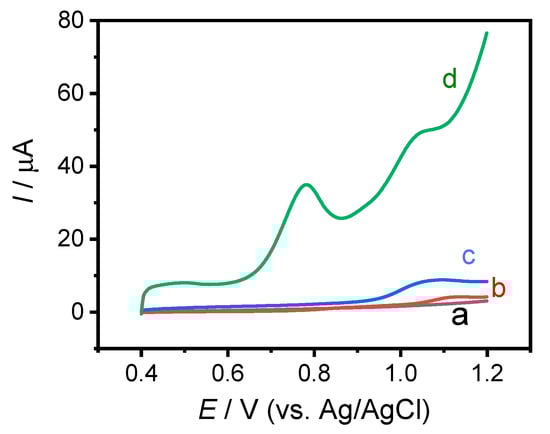 Linear sweep voltammetry curves (LSVs) recorded on different electrodes in 0.1 M pH 2.5 phosphate buffer solution at scan rate of 100 mV s−1. (a,b) bare GCE in the absence and presence of IAA (80 µM) and SA (80 µM), respectively; (c) GO/CCE in the presence of IAA (80 µM) and SA (80 µM); and (d) GH-3.5/GCE the presence of IAA (80 µM) and SA (80 µM). Scan rate: 100 mV s−1.