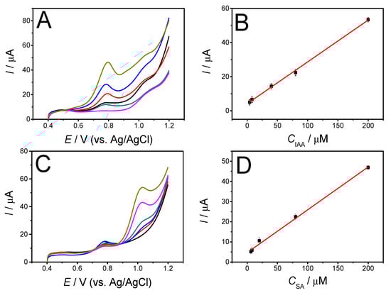 The individual detection of IAA and SA on GH/GCE were carried out by LSV measurement. As shown in Figure 6, using the IAA and SA mixture when increasing the concentration of one and keeping the other unchanged, the oxidation peak current increased linearly with changing constituent, unaffected by the unchanged constituent. For example, in the presence of 6.0 μM SA, IAA can be detected from 4.0 to 200.0 μM (Figure 6A,B), and in the presence of 6.0 μM IAA, SA can be detected from 6.0 to 300.0 μM in phosphate buffer solution (Figure 6C,D), with LODs (S/N = 3) of 1.43 μM for IAA, and 1.79 μM for SA. The linear relationship between the sensor current (I, μA) and target concentration (C, μM) are as follows: