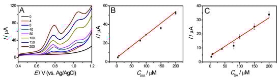 The results of simultaneous determination of both IAA and SA are shown in Figure 7. The oxidation peak currents at different potentials of IAA and SA increased simultaneously with increasing concentrations, with LODs (S/N = 3) of 1.42 μM for IAA and 2.80 μM for SA. The linear calibration curves of IAA and SA in the tested concentration range from 4.0 to 200.0 μM are as follows: