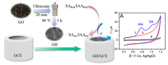 Herein, we prepared GH using the hydrothermal method at a relatively low temperature. Taking advantage of the porous and 3D-networked structure of GH, we constructed an electrochemical sensor for simultaneous detection of IAA and SA on a GH modified GCE (GH/GCE) (Scheme 1), and the electrooxidation behavior of IAA/SA were investigated as well. After the absorption on the GH/GCE, IAA and SA are readily oxidized within the potential window at different potentials facilitating their selective and simultaneous detection and quantification.