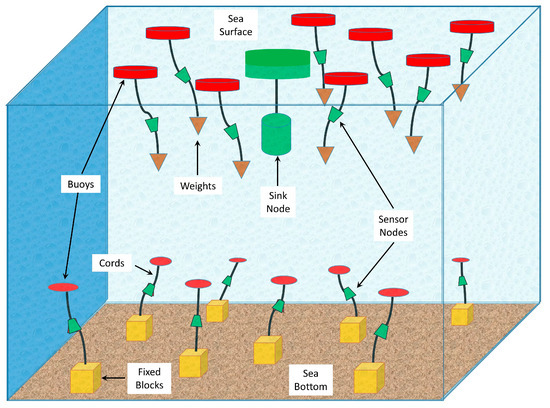 Underwater wireless sensor networks (UWSNs) have many applications related to environmental monitoring, disaster alerts, and military surveillance. UWSN may be deployed in either shallow or deep waters. When a sensor network is deployed in shallow waters and sensors are attached to the bottom of the sea, a 2D deployment of the network is considered. In deep waters, the nodes are suspended by a rope or a chain, which is attached to the surface buoys or the anchors at the bottom of the sea (Figure 1). The suspended sensor nodes in 3D networks keep moving in all directions. This movement is limited by the length of the connecting rope or chain. The continuous random movement of the nodes makes the protocols design more challenging in 3D networks.