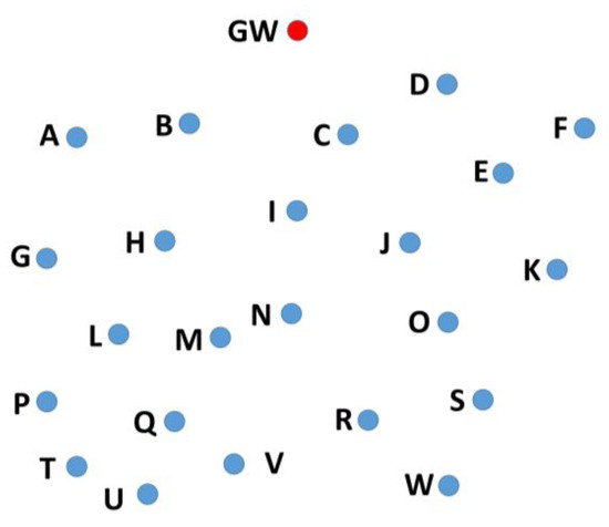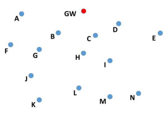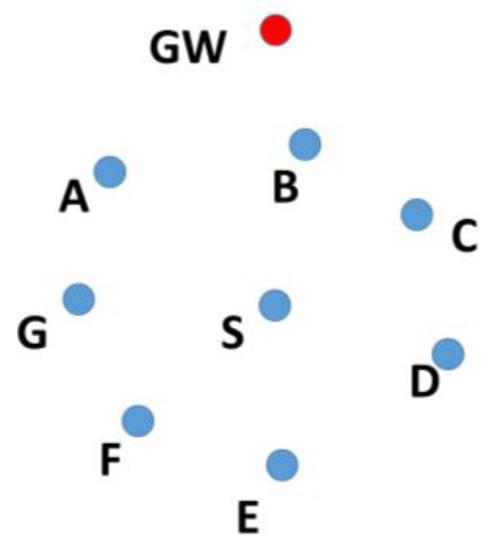 In a cooperative network, the nodes farther away from the sink node, also known as the gateway (GW) node, send their data to the GW with the help of intermediate nodes known as relay nodes. To select a relay node, the position of its candidate nodes should be known. For example, nodes A, B, C, D, E, F, and G in Figure 2 are at one hop distance from node S. All of these nodes will receive the data transmitted by node S, but only the nodes closer to the GW should retransmit the data. Therefore, before node S can select one of these nodes, it needs to know the position of nodes A, B, C, D, E, F, and G.