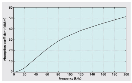 where (km) is the transmission range of the acoustic signal, is the spreading factor, (in dB/km) is the absorption coefficient, and (kHz) is the frequency. The value of is for cylindrical spreading, and for spherical spreading. A graph of absorption coefficient versus acoustic signal frequency is depicted in Figure 3 [20]. We can see that for frequencies up to 20 kHz, is <4 dB/km (approximately).