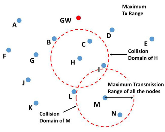 In the case of a short distance between the sender and the receiver, less transmission energy is required by the sender to transmit the packet. Therefore, when the weight of the RSS is set to maximum (i.e., 1), the closer candidate node is selected. This saves energy at the sender node. However, this approach may decrease the throughput if too many hops are added in the path between the original packet sender and the gateway. Therefore, two more metrics are considered at the time of selection of the forwarding node: number of hops and number of neighbors. The first one is because the number of hops affects the energy consumption and throughput. The second one is because a high number of neighbors means a better chance to be selected as the forward node, so it is a good metric to be considered. To better understand the idea, a scenario is considered. Suppose that a node, V, has two candidate nodes, Q and M, as shown in Figure 6. Node Q is 300 m away from node V, has five neighbors (U, T, P, L, M) and can reach the gateway in four hops (L–H–B–GW), whereas node M is 600 m away from node V, has four neighbors (Q, L, H, N) and can reach the gateway in three hops (H–B–GW). At the time of forwarding node selection, node V will select the node based on all three metrics. The weights given to each metric will influence the selection accordingly. The selection is based on these three metrics to achieve a good balance between the throughput and the energy consumption. Suppose the shortest distance is given the highest weight, then node Q will be selected. If number of neighbors is given the highest weight, then node M will be selected, and if number of hops is given the highest weight then again M will be preferred over Q.