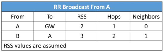 Figure 10. Metrics in the RR packets sent by node B. - At this point, C compares the RSS, the least number of hops, and the least number of neighbors to form the routing path with A or B;