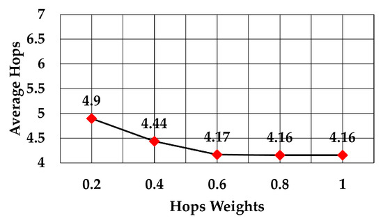 The average number of hops using weights between 0.2 to 1 is shown in Figure 13. The graph shows how that figure decreased as the weight increased. This means that a node prefers to select the forwarding node which needs a smaller number of hops to reach the gateway. In this case, the throughput increased due to the smaller number of hops to reach the gateway, although this may increase the average energy consumption per node. Also, the average number of hops became almost constant after 60% weight of hops. Comparison of the average number of hops to reach the gateway when the RSS weight was the maximum (the other two weights were zero) and when the number of hops weight was the maximum (the other two weights were zero) shows that the average number of hops decreased by more than 30% (6 versus 4.16 average hops).