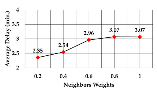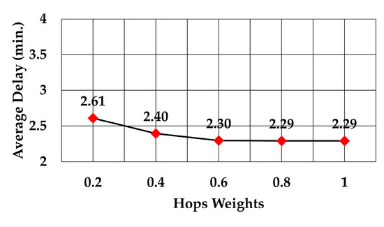 The analysis of packet delay from the node sending data to the gateway showed that it followed the same trend as the average number of hops, as can be observed in Figure 15, Figure 16 and Figure 17. In the case of the least number of hops, the maximum weight decreased the delay by 12.2% compared to delay at weight = 0.2 (2.29 versus 2.61 min), 19.6% compared to delay at the maximum weight of RSS (2.29 versus 2.85 min), and 25.4% compared to delay at the maximum weight of least number of neighbors (2.29 versus 3.07 min).