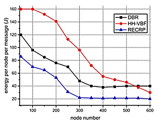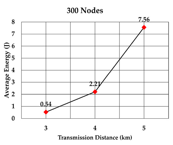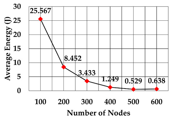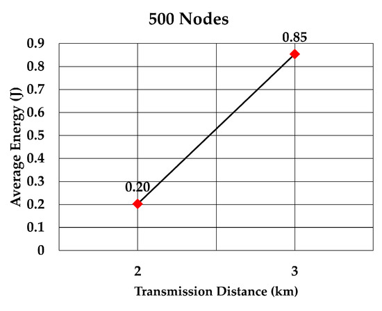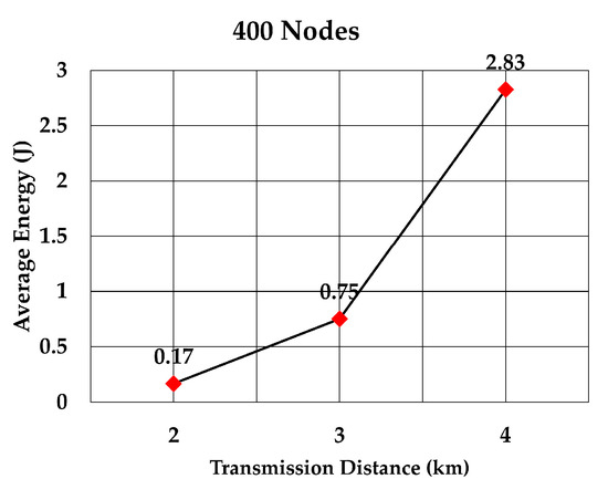 The average energy consumption of a node to send a data packet was analyzed for multiple densities of the nodes. To compare with values given in RECRP [7] we assumed the same simulation parameters. The network area was 10 km × 10 km × 10 km and the number of nodes was 100, 200, 300, 400, 500, and 600. The data packet size was 256 bits and the transmission range was adjusted according to the node’s density. The average energy consumption for multiple transmission range for each number of nodes was simulated as shown in Table 5. The simulation was run 10 times for each transmission range.