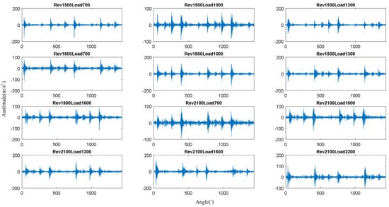 Through the OCMS, vibration signals of different operating conditions could be measured. The vibration signals of 12 different operating conditions are shown in Figure 3.