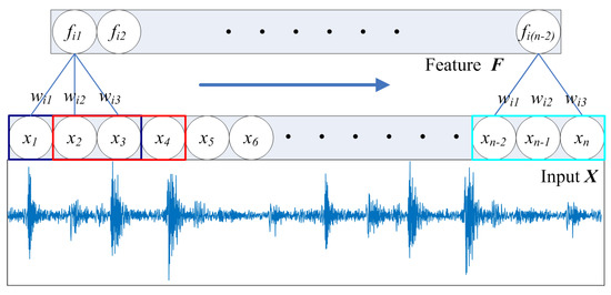 It was proven that a 1D CNN can be applied to the time series analysis of sensor data. In 1D CNNs, features can be extracted from segments through 1D convolution, which is a weighted sum operation between the weight matrix and the vibration data in each segment, with the addition of the overall bias. Every convolution extracts a feature from a local receptive field, and the window of the convolution kernel slides across the entire input sequence with a fixed step to achieve all features. The weight sharing exists to maintain the weights of the convolution kernel in the sliding process. As shown in Figure 4, the size of the i-th convolution kernel is shown, featuring weights (wi1, wi2, wi3) in a 1 × 3 format, with the bias left out for clarity. The corresponding feature vector F (fi1, fi2, fi3, …, fi(n−2)) can be obtained from the input signal X (x1, x2, x3, …, xn) with one step of the convolution kernel.