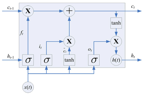 A recurrent neural network (RNN) is a kind of neural network which can be used for sequential data analysis, while the LSTM is a specific kind of RNN. Compared with a traditional RNN, a memory cell and gating mechanism are introduced to deal with the existence of gradient disappearance and gradient explosion during the training of long sequences. The gating mechanism can be used to control the transfer state, which is designed to remember the important information and forget the unimportant information. The memory cell of an LSTM is shown in Figure 5.