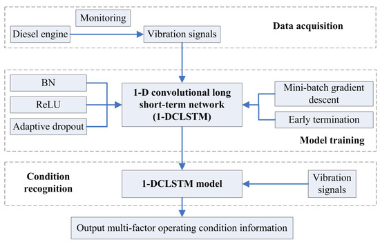 To determine the multi-factor operating condition information of a diesel engine, a condition recognition method using 1D-CLSTM is proposed. Firstly, acceleration sensors were used to monitor the status information of a diesel engine under different operating conditions. Considering the characteristics of the vibration signal, some performance improvement techniques were adopted in the 1D-CLSTM, such as BN, ReLU activation function, adaptive dropout. Moreover, mini-batch gradient descent and early termination were adopted in the training of 1D-CLSTM to achieve a fast training speed and avoid overfitting of the model. Accordingly, the 1D-CLSTM could be trained using supervised learning. After training, the trained 1D-CLSTM classifier could be used for the classification of multi-factor operating conditions. The flowchart of the multi-factor operating condition recognition method is shown in Figure 7.