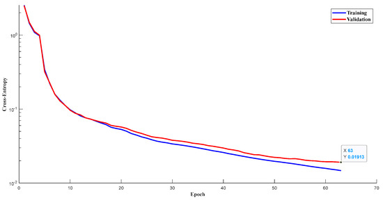 The loss function, which measures the degree of difference between the predicted value and actual value, is a non-negative real value function. A smaller loss function denotes better robustness of the model. Cross-entropy is frequently used for loss calculation in neural network training, as shown in Equation (7).