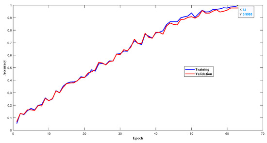 The vibration signals were in the form of a time series, used as the input data for training the designed network, with a total of 7200 samples. The whole dataset was randomly divided into two sets: 80% for training and 20% for validation. In other words, the training set had 5760 samples, and the validation set had 1440 samples. With the continuous iterative training of 1D-CLSTM, the losses of the training set and validation set decreased as the number of epochs increased, as depicted in Figure 8. On the contrary, the accuracies of the training set and validation set continuously improved, as depicted in Figure 9. According to the early termination, the model training stopped when the loss of the validation set stopped decreasing. The training of 1D-CLSTM stopped at the 63rd epoch when the cross-entropy of the validation set was 0.01913 and the accuracy of the training set was 0.9953. Therefore, the corresponding 1D-CLSTM classifier is a desired classification model for multi-factor operating condition recognition.