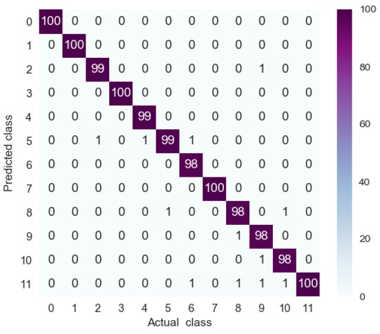 A confusion matrix, which contains information about actual and predicted classes, was used to describe the generalizability of the 1D-CLSTM classifier [32]. The testing set had a total of 1200 samples, with 100 samples for each operating condition. The confusion matrix for the testing set is shown in Figure 10.