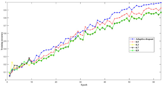 The convergence process in model training is an important factor for achieving a classifier with excellent performance. Dropout serves as an effective approach to improve the model sparsity and prevent overfitting in model training. To find the best connections in the designed 1D-CLSTM, a suitable dropout ratio was very important. Adaptive dropout, due to its flexibility depending on network capacity, is able to maintain the balance between model performance and model sparsity. To check the effect of adaptive dropout, training accuracy curves of different dropout ratios were plotted, as shown in Figure 11. According to the early termination, the model training using adaptive dropout stopped at the 63rd epoch, and the comparison of training performance with different dropout ratios was conducted within 63 epochs.