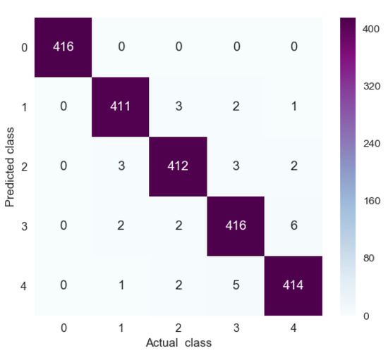 Generally, the data measured from different engine types vary greatly, and the 1D-CLSTM classifier would need to be trained before use. The test set of V20DE contained 2101 samples, and the corresponding confusion matrix is illustrated in Figure 13. As depicted in Figure 13, 32 samples out of 2101 were misclassified, and the corresponding accuracy was 98.48%.
