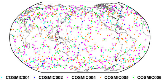 The distribution of COSMIC (Constellation Observing System for Meteorology, Ionosphere, and Climate) occultation event on 1 January 2014. Different colors represent different COSMIC satellites.