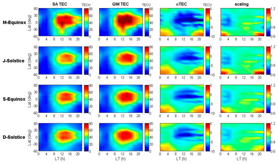 Figure 3 demonstrates the Jason-2 and GIM TEC variations with geographical latitude and local time for the above defined four seasons of 2014. The x-axis and y-axis in each subplot are the local time and geographical latitude, respectively. The four defined seasons (M-Equinox, J-Solstice, S-Equinox and D-Solstice) are indicated in Figure 3 from the top to bottom row. Firstly, the ionospheric VTEC is retrieved from the Jason-2 dual-frequency observations for each season, and the latitude and local time of the footprints are recorded with the corresponding VTEC values. Then, the SA TEC at each footprint is indicated in the first column; Secondly, the VTEC of ground-based GPS is interpolated into the location of footprint by using the IGS GIM products; the result of this step is shown in the second column. The third column shows the bias between Jason-2 and GIM TEC (), and the fourth column shows the scaling factor between Jason-2 and GIM TEC ().