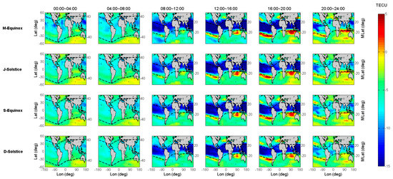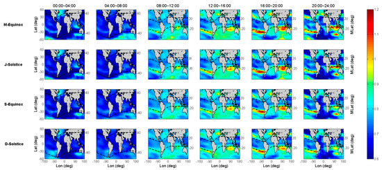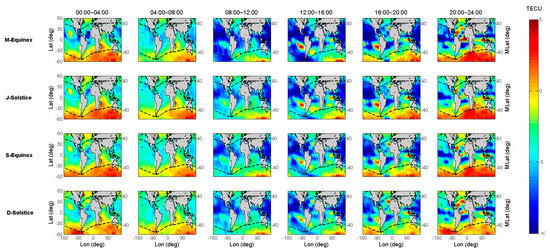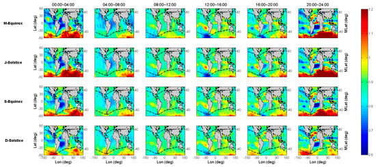 In Figure 4 and Figure 5, the seasonal results are indicated in the similar way as Figure 3, where the x-axis is replaced by geographical longitude, and the y-axis still denotes geographical latitude; the panels at different columns represent different local time periods with a duration of 4 h, and the black dashed line indicates the geomagnetic latitude line at ±40°. After considering the longitudinal differences, the IGS GIM TEC underestimated phenomenon were mainly found to be distributed over sea areas near the geomagnetic equator, and the mid-high geomagnetic latitudes exceeded 40° of the southern hemisphere at a certain time 20–04 (LT). Based on the different column panels, different local time periods clearly have different anomaly distributions. From 08:00 to 16:00 (LT) as shown in the third and fourth columns, the underestimated GIM TEC are scattered in the South Indian Ocean, the South West Pacific Ocean, and the west coast of South America. In general, the area of the underestimated phenomenon distribution during this period is not obvious compared with that of the other period. However, when the night falls, the underestimated areas in the southern hemisphere begin extending to the most mid-high geomagnetic latitude oceans, and the largest underestimated area range appears at midnight. Compared with Figure 3, this phenomenon lasts until 06:00 (LT). For seasonal variations, during the D-Solstice season, the underestimated phenomenon at mid-high geomagnetic latitudes seems to be not very obvious compared to those of the other defined seasons. In summary, the underestimated IGS GIM TEC are mainly distributed in the mid-high geomagnetic latitudes of the southern hemisphere and nearby the geomagnetic equator where ionosphere anomalies occur frequently. It is shown that the underestimated phenomenon is also experienced more in the nighttime than in the daytime, as well as more often in the M-Equinox, J-Solstice, and S-Equinox seasons than in the D-Solstice season. The biases and scaling factors almost reach 5 TECU and 1.2, respectively, in the region exceeding 40 geomagnetic latitudes of the southern hemisphere at a certain time 20–04 (LT).