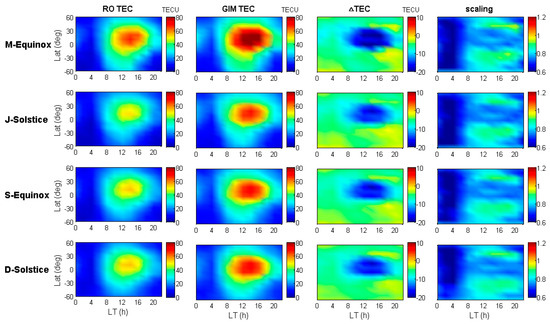 The fourth column of Figure 6 shows the scaling factors between COSMIC and IGS GIM TEC (). As seen in this column, there is a diurnal scaling variation with well-defined boundary at 08:00 (LT) in all seasons. From 00:00 to 08:00 (LT), the distribution of the scaling does not follow the regularities of the latitude variation, and the values are basically maintained around 0.6. After 08:00, the distribution of the scaling begins to show north-south symmetry with 0.85~0.95 around the 40° latitudes and 0.75~0.8 around the low latitudes.