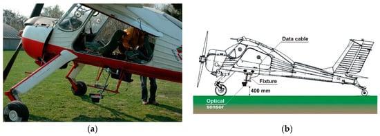 Installation of the CORREVIT L400 sensor on the test airplane. (a) a photograph showing the test airplane with the Correvit optical sensor, (b) a schematic of the installation.