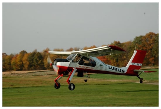 A four seat, single engine, multipurpose STOL (short takeoff and landing) aircraft PZL 104 Wilga (PZL Warszawa Okęcie, Warszawa, Poland) was used for the tests (see Figure 4). The airplane is a high wing monoplane, powered by the AI 14R 192 kW radial 7 cylinder engine (PZL Kalisz, Kalisz, Poland). It has a non-retractable, tail-dragger-type landing gear with main wheels with brakes, and low-pressure tires of 500 × 200 mm in size. The main legs are rocker type with oleo-pneumatic shock absorbers. They are castored and have a positive rake angle of 18°; the axle offset is 400 mm. The airplane is 8.10 m in length with a wing span of 11.2 m and wing area of 15.5 m2. The empty mass is 900 kg. In the flight tests, there were four persons on board and the takeoff weight with 125 liters of fuel was 1150 kg.