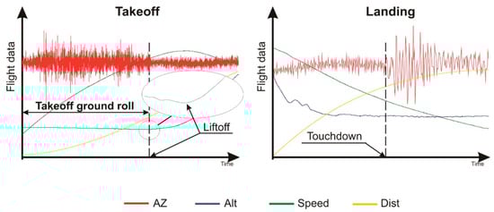 Data from the GNSS/INS system contained numerous kinematics measures of aircraft motion, but only a few of them were used and evaluated: (1) height (altitude) above the ground, (2) ground speed, and (3) takeoff or landing ground roll. Of high importance for the precision of the analysis was to determine the time moment when the aircraft lifts off and when it touches down. This was done on the altitude graphs. Example altitude graphs are shown in Figure 5. Here, we had the time points of the lift off and touch down. Knowing the time coordinates, it was possible to analyze the mentioned measures (i.e., altitude, speed, and ground roll), and typical sets of graphs for takeoff and landing are shown in Figure 5. The numerical data were collected for further analysis (integrating the velocity courses).