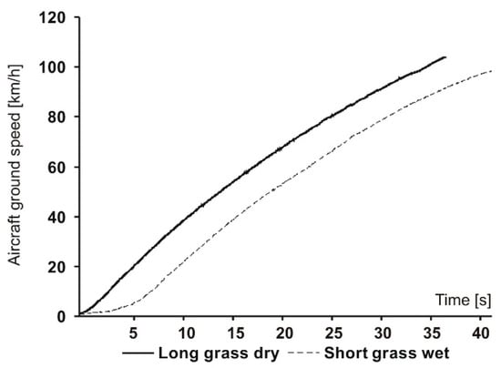 These results are from the optical sensor. Figure 6 shows two sample airplane ground speed courses versus time. A comparison can be made between the two airfield conditions: short, wet grass and long, dry grass. We can see that the difference was in the early stage of the takeoff, when the airplane accelerated intensively. The difference was in the course of the ground speed: for the short, wet grass, this course had a less intensive increase in the first few seconds. This difference was quite surprising. It may be caused by a greater rolling resistance from the uneven pavement which is more pronounced when the grass is low. Long grass compensates for surface irregularities, and then the increase in speed during takeoff is more intensive.
