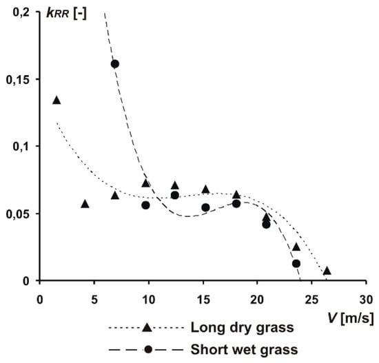 Having all parameters values, we performed data integration. Using the Euler method, the takeoff speed course was divided into several small-time intervals (i.e., 10), assuming the acceleration was constant during each interval, and the rolling resistance coefficient kRR was obtained for the end of each time interval (Figure 7). The complete algorithm for determining the kRR from the speed courses is included in the work by Pytka [8]. It is worth noting that the value of rolling resistance coefficient is not constant in the takeoff speed range, and, additionally, the course of this coefficient value decreases with the area of momentary increase in the middle range of the takeoff speed. The difference between the two surfaces—short grass and long grass—was significant, although the nature of the course remained similar. The shape of the course was interesting and may result from rheological effects occurring in plant matter (in the grass). Namely, the effect of deformation speed caused an increase in the elasticity of the grass material which was manifested by lower losses associated with the absorption of deformation energy. It happened at higher speeds, and, at low speed, we observed the opposite. In the middle range, on the other hand, the kRR value was influenced by aerodynamic forces that relieved the chassis wheels.