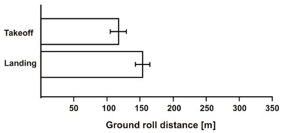 During the first experiment, there was a 5 m/s wind and the aircraft was flown facing the wind. The results of the takeoff and landing distances are presented graphically in Figure 8. There averaged values of distance with error bars are shown.