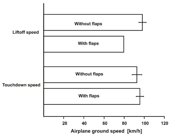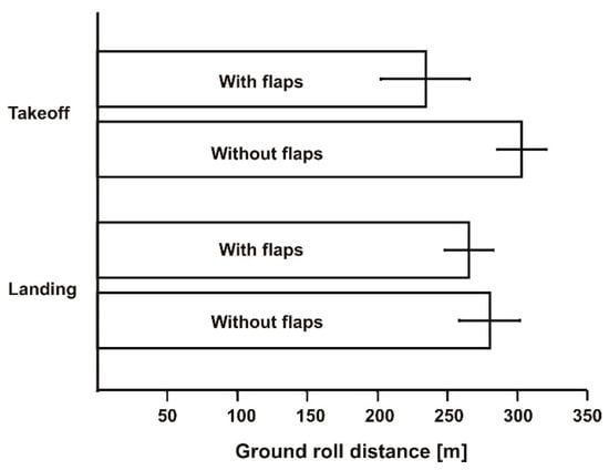In this experiment, the aircraft was taking off with normally deployed flaps (21°). On the second day, the wind was 0–1 m/s, and the results were much different. We performed tests with deployed flaps as well as with no flaps. The averaged values are presented together with error bars in Figure 9. The takeoff and landing distances were significantly longer. The effect of grass length was the probable cause, although we were unable to analyze the effect of wind precisely. Besides, based on the comments by the pilots, this airplane was not as sensitive to headwinds during takeoffs; this is the effect of a powerful engine with shaft reduction and high diameter propeller.