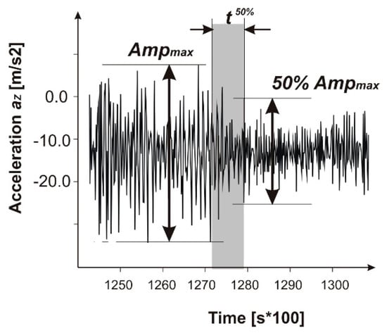 On the other hand, this factor for the GNSS/INS sensor depends upon the method of data reduction which is described in the second section of this paper. When analyzing the time courses of the acceleration, it is noticeable that the amplitude of acceleration suddenly drops—this is the moment when the airplane lifts off. But the exact time point is difficult to determine. A method of simple discrimination has been applied, and it was assumed that the liftoff point is where the amplitude reaches 50% of its value, taken from the ground roll reading. A time between the 50% and low amplitude is set as a determinant for the accuracy (Figure 11). Therefore, the human factor for the GNSS/INS method is as follow: