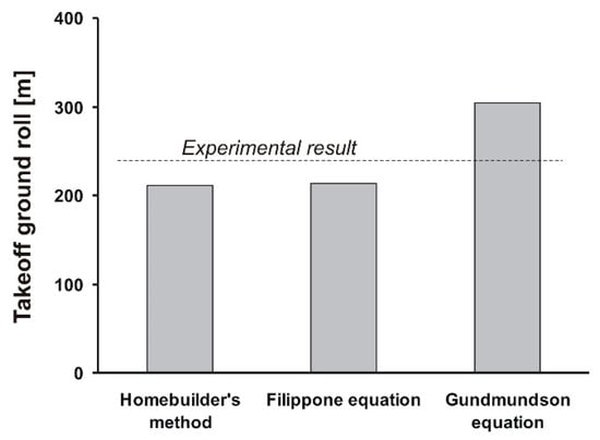 The next step in this research was to compare the obtained experimental results of the takeoff ground roll distances with the calculated results. The literature describes several equations with different degrees of simplifications and assumptions that allow for a calculation of takeoff and landing distance [16,17]. We chose three different approaches: a simple equation used by designers of homebuilt aircrafts, a general equation for airfield performance, and an equation for GA aircrafts for design projects.
