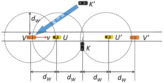 Unfortunately, under the two-hop whisper check, when the distance between the attacker’s true position and the message receiving vehicles is less than , the attacker can also exploit the overheard whisper identifiers (WIDs) to extend the attack range. Figure 2 depicts the situation. Here, the attacker K can obtain from , for and . Echoing this overheard in its whisper , the attacker can extend its attack range from to . Not only that, after V passes K, a similar situation can happen if there is another intermediate vehicle (e.g., B) between the attacker and the victim.
