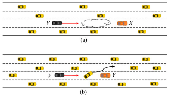 In (a), vehicles move at 80 km/h in the rainy road condition, where the road surface friction coefficient is 0.3 [33]. The headway distance between vehicles on the same lane is set to 100 m. In this case, the host vehicle V cannot detect the stopped vehicle X due to poor visibility. In (b), vehicles move at 120 km/h on dry road where the friction coefficient is 0.8. The headway distance between vehicles on the same lane is set to 50 m. There is a vehicle between V and the stopped vehicle X. The stopped vehicle warns approaching vehicles through BSMs. Other vehicles check the distance to the stationary vehicle at the moment of receiving the first BSM that passes the whisper check. In (b), the intervening vehicle changes lanes to evade Y. The human reaction time typically ranges from 0.7 s to 1.5 s [34]. In this paper, we set it to 1 s. When vehicles move at 80 km/h on a rainy road or 120 km/h on a dry road, the braking distances based on our assumptions are 104.5 m and 102.8 m, respectively. Given these parameters, we compute the distance d between the host vehicle and the stopped vehicle when a whisper checked the first BSM from the stopped vehicle arrives at the host vehicle. Based on d, Figure 4 shows the probabilities in the two scenarios that the host vehicle collides with the stopped vehicle as it could not stop in time. The collision depends on the message delivery loss ratio and latency experienced by the BSM from the stopped vehicle. Now, given the success probability of the forged message delivery, the vehicle collision takes place if